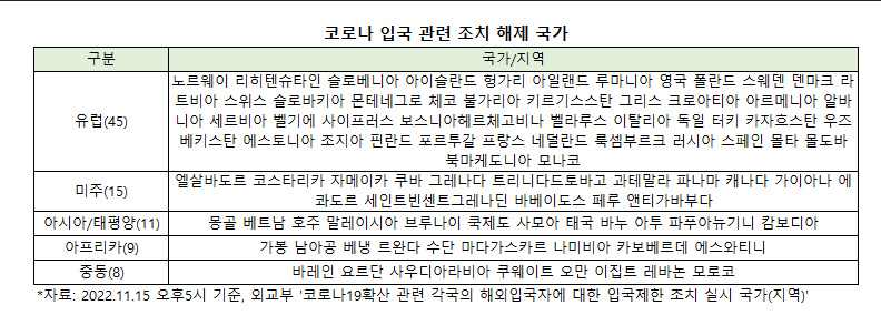 한국발 입국자에 대한 입국 관련 조치 해제 : 106개 국가 ‧ 지역