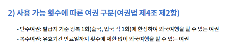 단수여권은 급하게 또는 잠시 해외를 방문할 때 쓰며, 복수여권은 자주 또는 오래 해외를 방문할 때 쓰입니다.