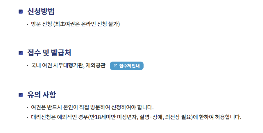 자세한 내용은 외교부 홈페이지 (www.passport.go.kr)에서 확인하실 수 있습니다. 온라인으로 여권 신청이 가능한 경우는 기존에 전자여권을 한 번 이라도 발급받은 우리 국민이며, 재발급 신청만 가능합니다. 생애 최초 전자여권 신청자나 로마자성명 변경 희망자 등은 온라인 신청이 불가하며 방문 접수가 필요합니다.