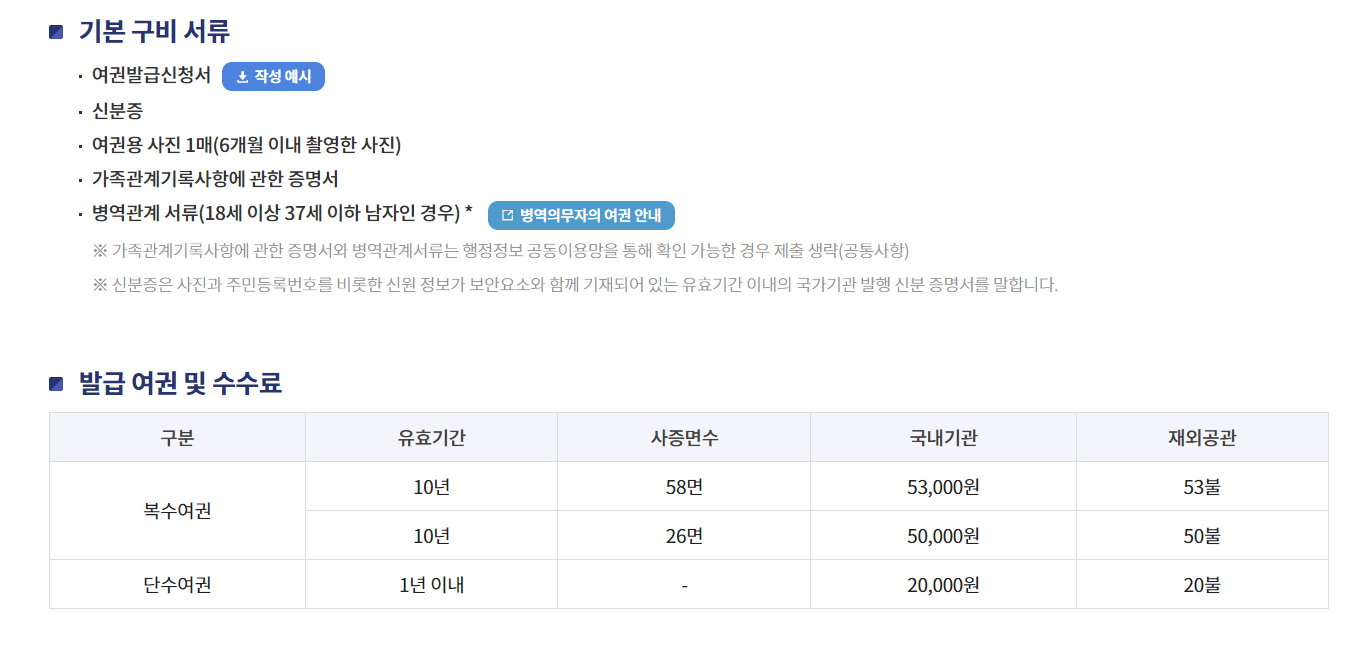 여권용 사진(6개월 이내에 찍은 상반신 정면 사진으로 가로 3.5cm x 세로 4.5cm 크기이며 머리 길이가 3.2 ~ 3.6cm 기준),여권 발급 신청서(외교부 홈페이지 에서 다운로드하거나 구청에서 제공하는 양식을 사용합니다.) 신분증(주민등록증, 운전면허증) 등 본인임을 확인할 수 있는 서류입니다. 병역 관련 서류(병역 의무자 또는 면제자의 경우 군입대예정통지서, 군필증명서 등 병역 상태) 증명할 수 있는 서류입니다. 수수료:(여권의 면수와 유효기간에 따라 다르며 국제교류 기여금을 포함한 금액입니다). 만 18세 이상의 경우 복수여권 (10년)은 53,000원이고 단수여권 (전자여권)은 20,000원입니다.