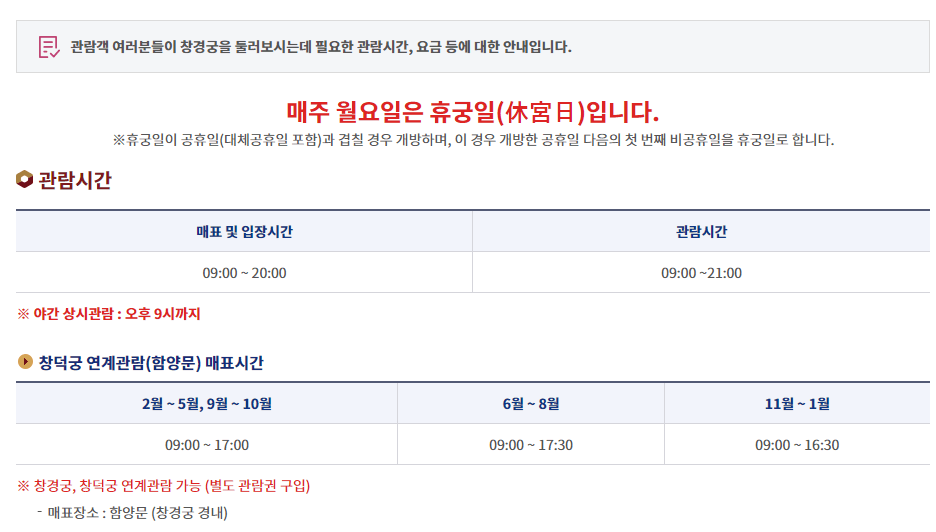 매년 4월부터 10월까지 창경궁은 밤에도 개방되고 있으며, 인터넷으로 예매할 수 없고 현장에서 표를 사야 합니다. 성인 한 명당 입장료는 1천원이고, 밤 7시부터 9시까지 구경하실 수 있습니다. 대온실내부는 11월개방, 12월~1월은 오후6시부터 비개방