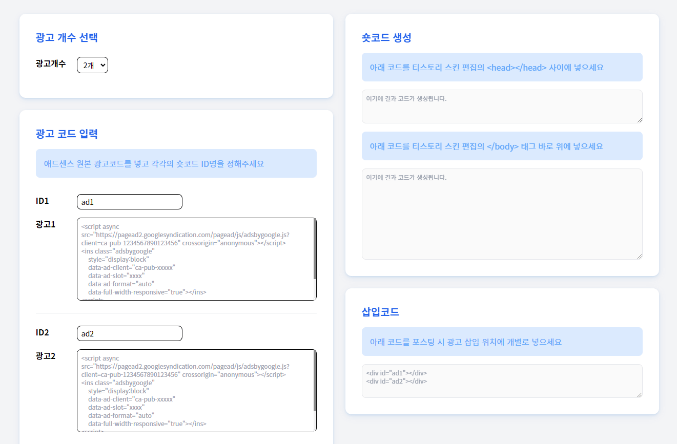 코드가 너무 길어서 들어가지 않거나 자꾸 오류가 날 때 숏코드 생성기에 넣어서 코드를 줄여주면 됩니다. 굉장히 간편하고, 애드센스 숏코드 생성 프로그램이라서 필요한 광고코드를 자동으로 줄일 수 있다는 매력이 있습니다.
